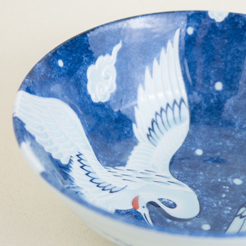 Este cuenco japonés de grulla destaca por su diseño elegante y sereno, inspirado en la iconografía tradicional japonesa. En el interior, una grulla blanca en vuelo se despliega sobre un fondo azul profundo con detalles que evocan el cielo y el agua, creando una escena delicada y armoniosa. El contraste entre el interior ilustrado y el exterior en tonos claros, decorado con pinceladas sutiles, aporta equilibrio y ligereza a la pieza.