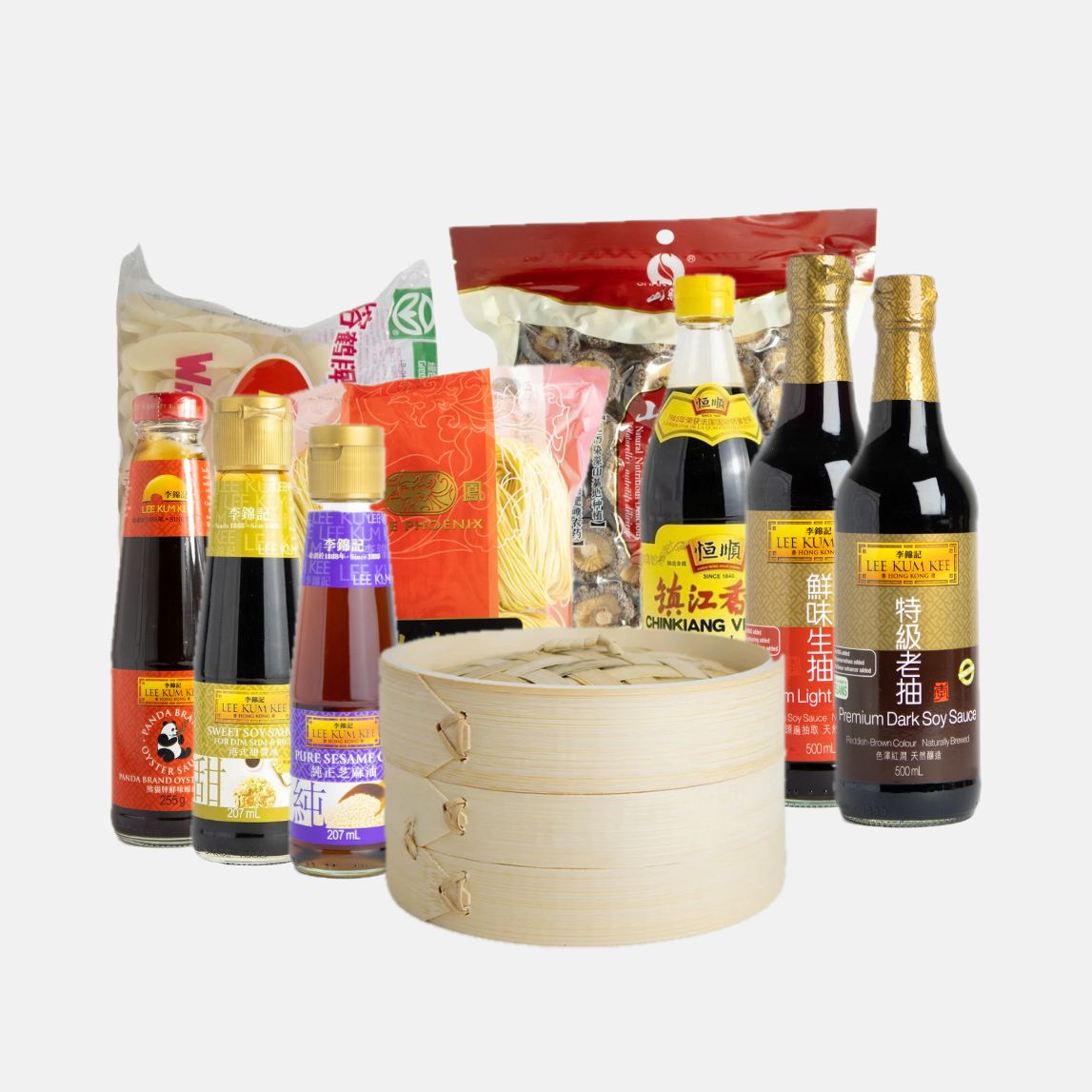 La combinación de salsas de soja clara y oscura, la salsa especial para dumplings, la salsa de ostras y el vinagre de arroz Chinkiang permite equilibrar sabores y recrear recetas clásicas con profundidad y matices. El aceite de sésamo aporta el toque final aromático tan característico de la cocina china. Los fideos de huevo chinos, el pastel de arroz y las setas shiitake completan el pack con texturas y sabores tradicionales, ideales para preparar un menú festivo de Año Nuevo Chino.