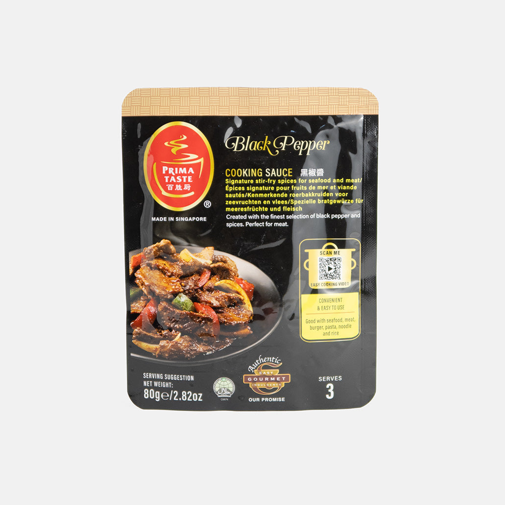 La salsa premium de pimienta negra de Prima Taste se elabora con una selección de pimienta negra de alta calidad y especias cuidadosamente escogidas. Es una salsa sabrosa e intensa que permite preparar platos con mucho cuerpo sin añadir conservantes. Solo tienes que añadir marisco o carne y tendrás una receta lista en pocos minutos, llena de sabor.